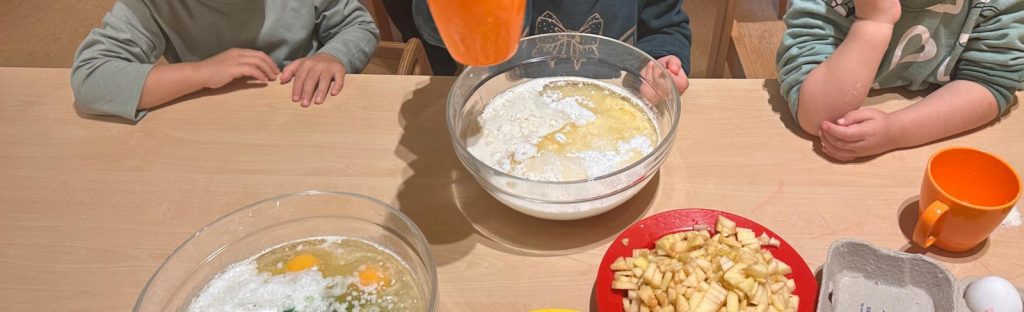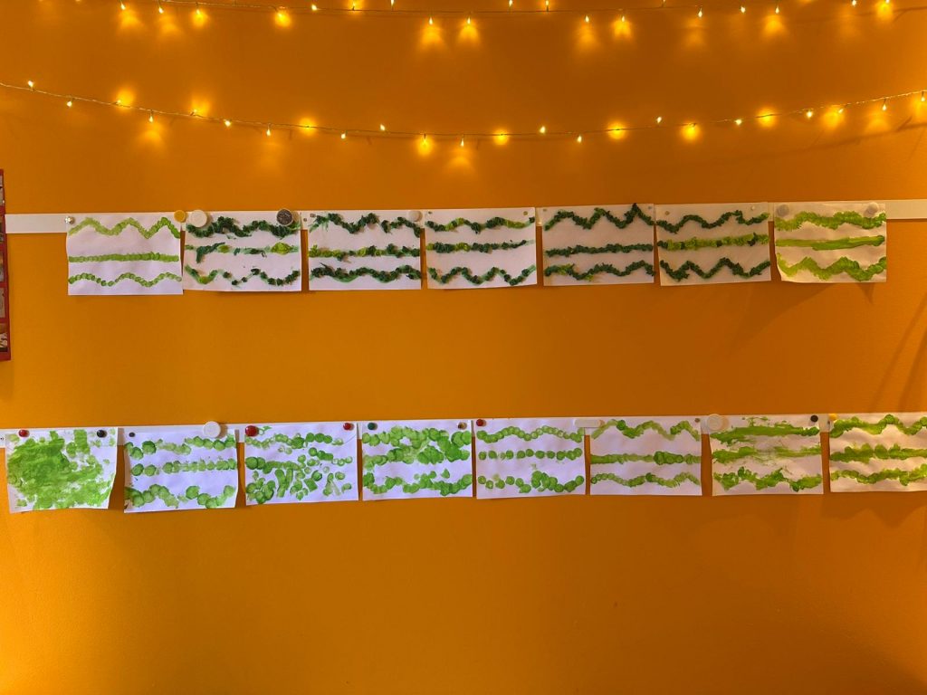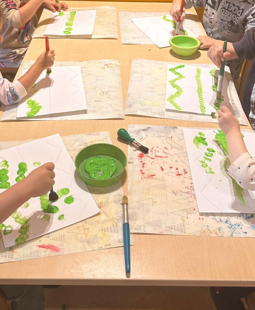 Im Kreativraum entstanden mit grüner Farbe tolle Bilder und Basteleien. Dazu veranstalteten wir Spiele mit grünen Materialien und backten leckere grüne Muffins. Beim Kinderyoga begegnete uns Grün in den Übungen Schlange, Schildkröte, Frosch und Baum.
