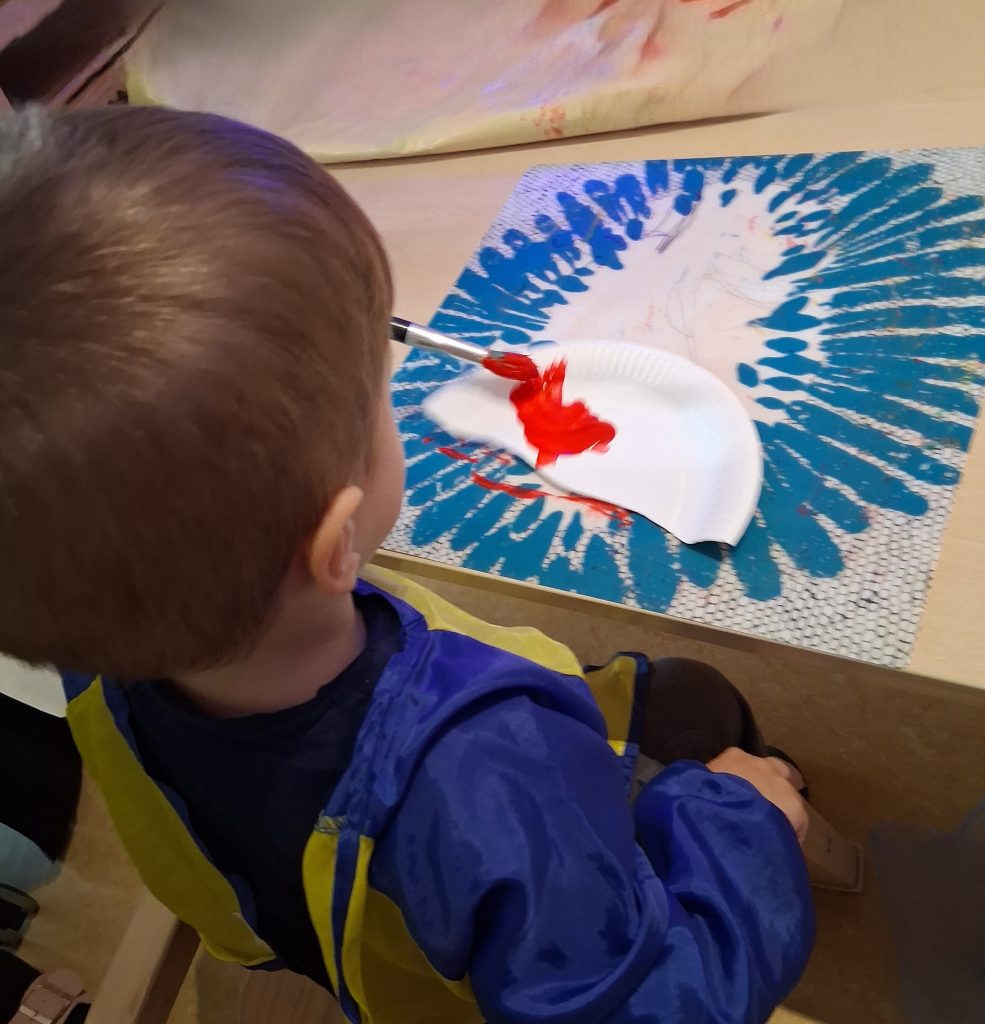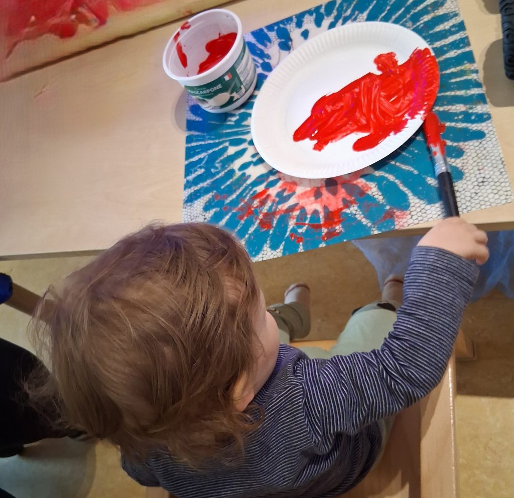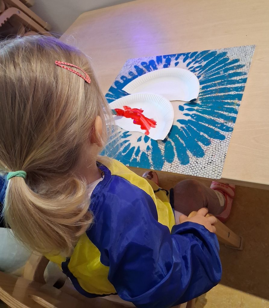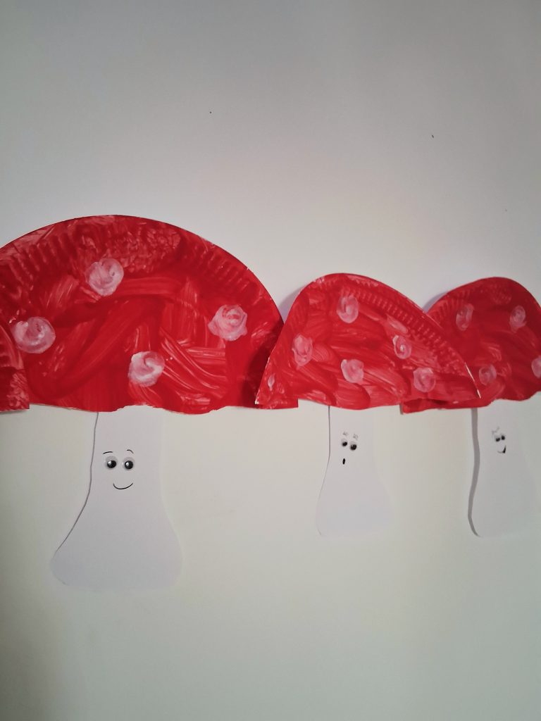 Im Kindergarten wurde es heute richtig herbstlich! Die Kinder haben runde Pappteller genommen und sie leuchtend rot angemalt. Schon sah es ein bisschen so aus, als hätten sie große rote Sonnen am Tisch liegen. Aber halt – da fehlte noch etwas. Also kam ein kleiner weißer Stiel hinzu, und schwupps – die Teller hatten plötzlich Beine! Jetzt sehen sie richtig aus wie Pilze! Genau so wie die, welche wir beim Spazierengehen in den Rehbergen gesehen haben. Und mit ein paar weißen Punkten dazu, wurden aus roten Tellern kleine Glückbringer. Am Ende des Tages stand der ganze Raum voller fröhlicher Pilze die aussahen, als hätten sie sich im Wald verirrt – nur bunter und lustiger!