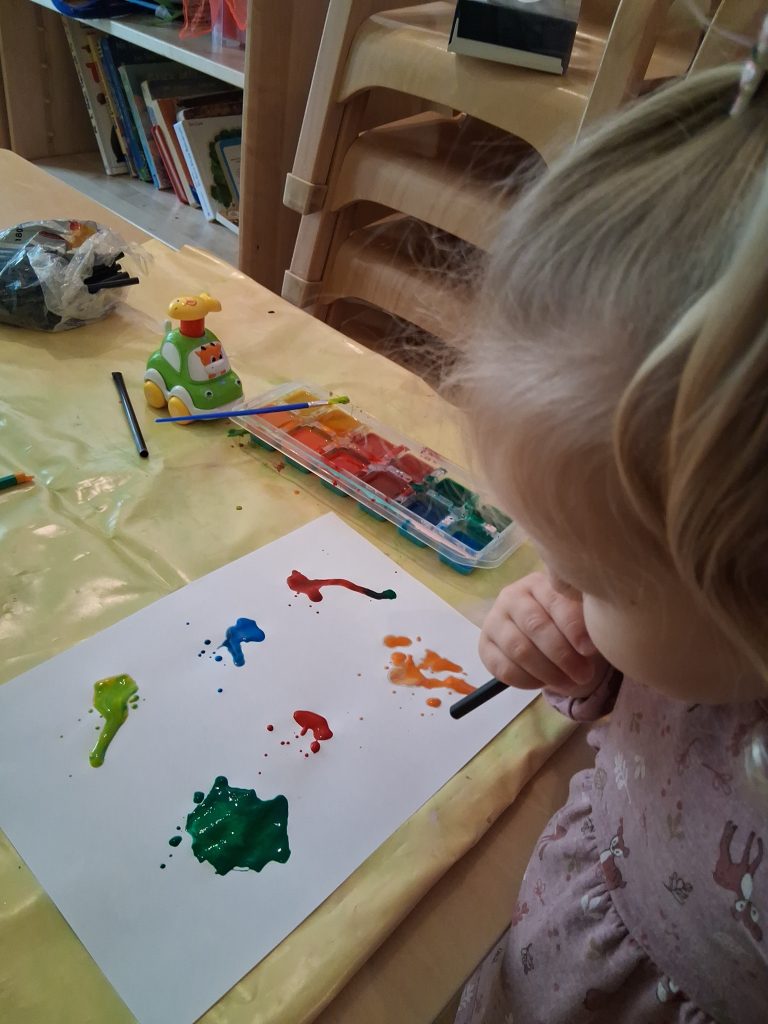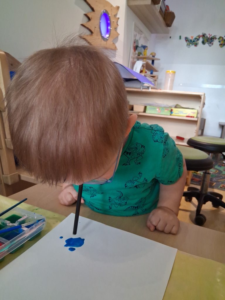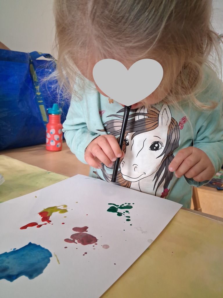 Mit Pinsel, Wasserfarben und Strohhalmen ausgerüstet haben die Kinder kräftig auf ihre Blätter geblasen. Dabei entstand nicht nur ein kunterbuntes Farbenspiel, sondern auch jede Menge sensomotorisches Training. Die Mundmotorik wurde spielerisch geübt, während die kleineren Kinder, die das Pusten noch nicht kannten, neugierig von den großen Kindern lernten und es mutig selber ausprobierten.