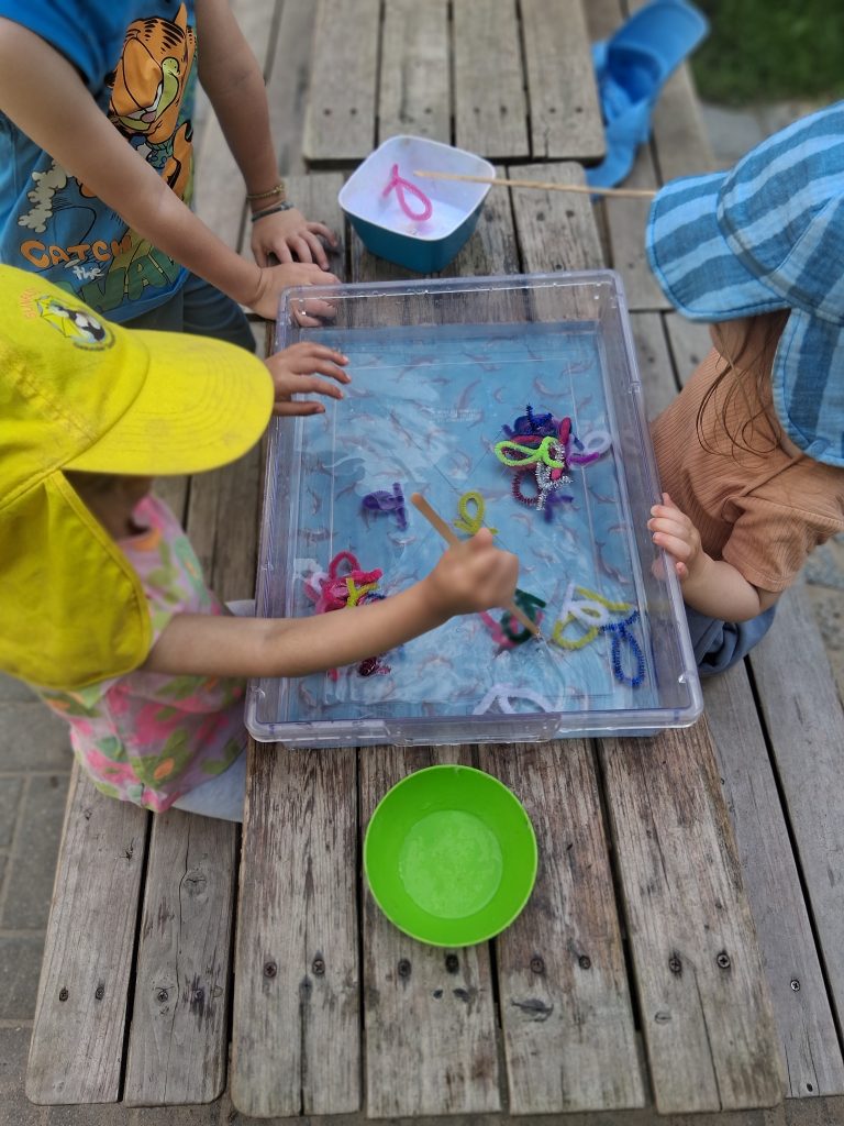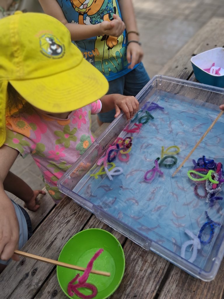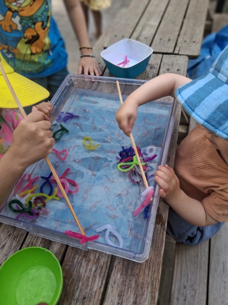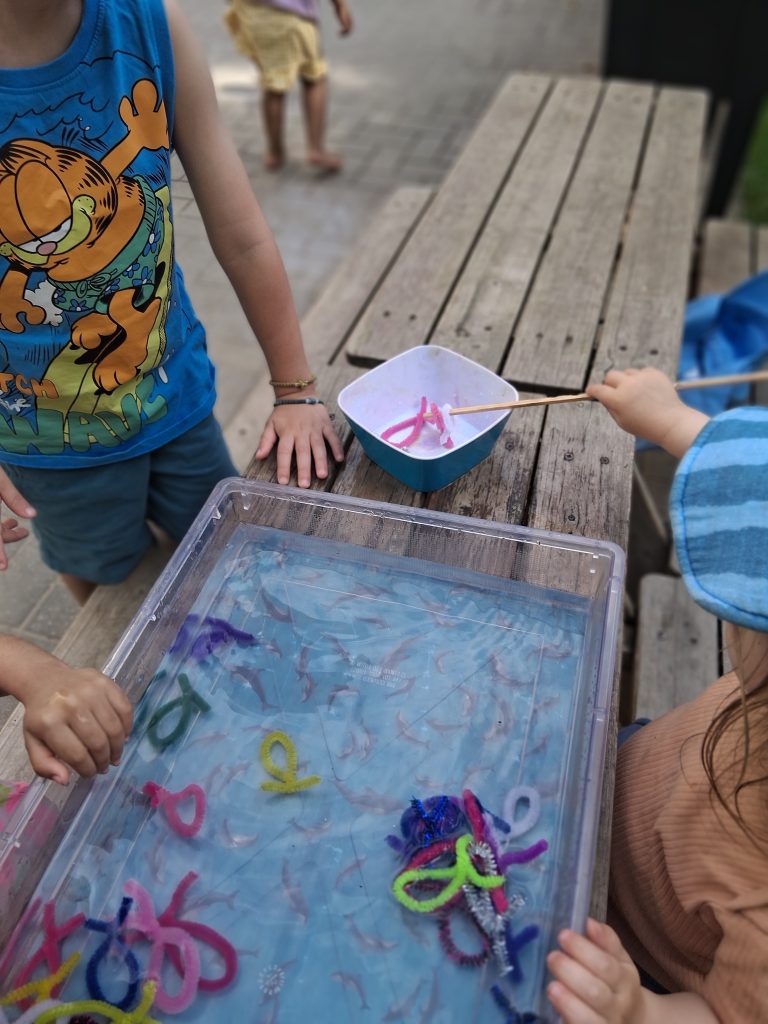 In einer durchsichtigen Wanne voller Wasser schwammen kleine, bunte Fische, die aus Pfeifenreinigern gebastelt waren. Die Kinder traten paarweise (spielerisch in einem Wettbewerb) gegeneinander an und versuchten, die Fische mit einem Holzstäbchen aus der Wanne zu angeln.