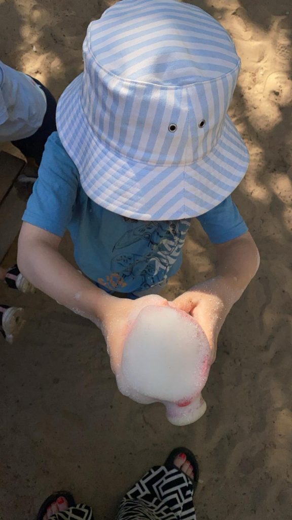Bei bestem Wetter haben wir im Garten mit unserem hergestellten Schaum gespielt. Die Kinder formten aus dem Schaum unterschiedliche Dinge. Zum Abschluss gab es noch eine Schaumschlacht. Alle hatten viel Spaß und es blieb kein T- Shirt trocken.