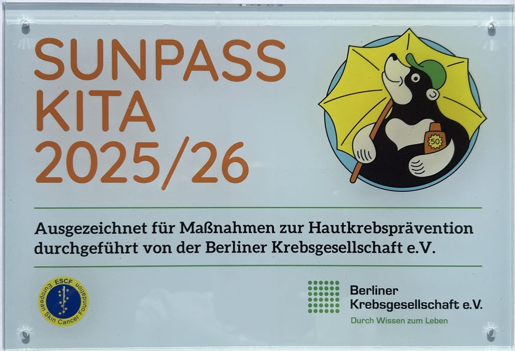 Die positiven Ergebnisse sind für alle zu sehen und zu spüren. Deshalb wurden wir auch für die Maßnahmen zur Hautkrebsprävention von dem Berliner Krebsgesellschaft e.V. ausgezeichnet und dürfen uns SUNPASS KITA 2025/2026 nennen.