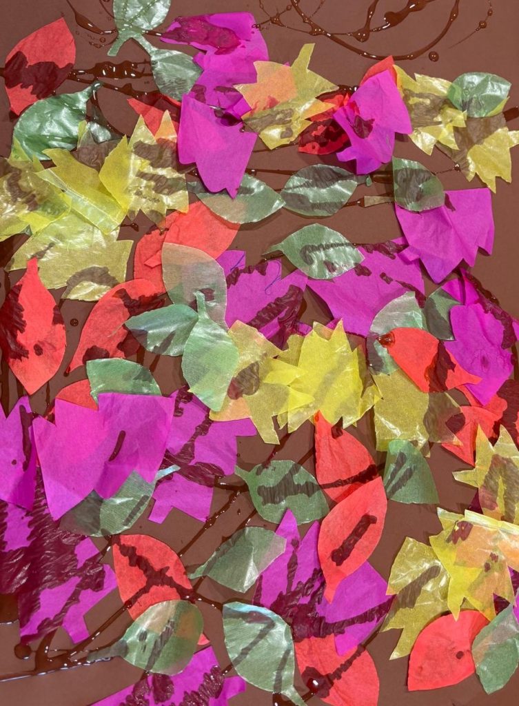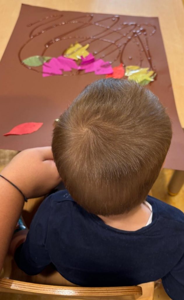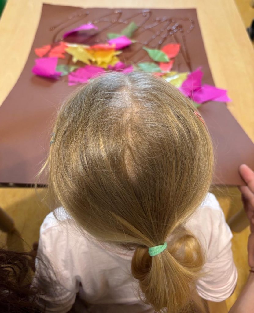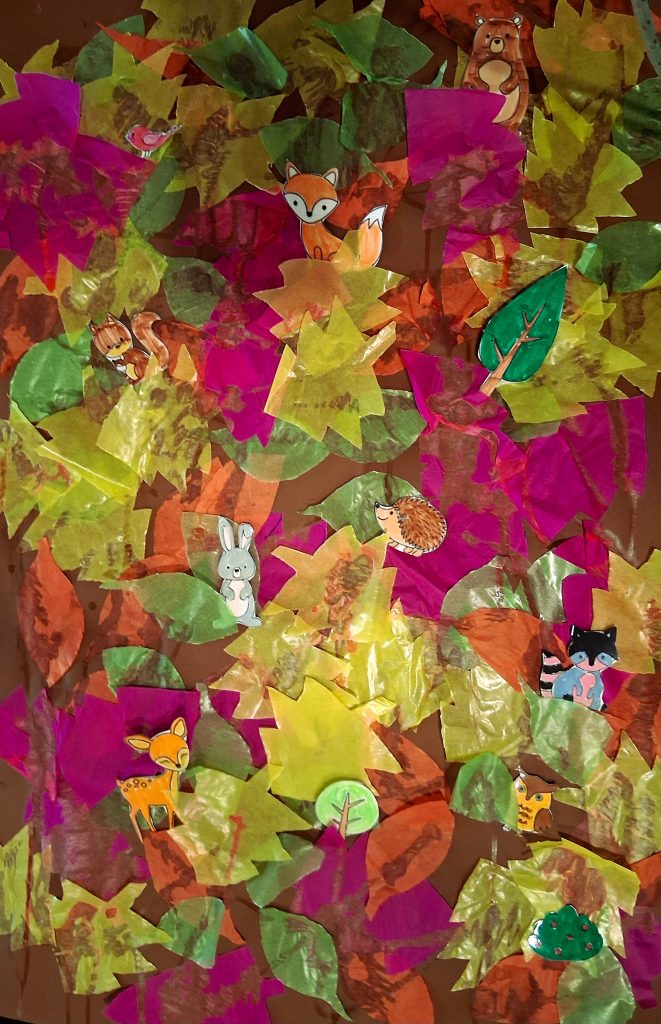 Heute wurde unser Gruppenraum zu einem kleinen Herbstwald. Zuerst legten wir ein großes braunes Blatt Papier auf den Tisch – es sollte der Waldboden sein. Ganz still und geheimnisvoll lag es da und wartete auf seine Blätter.
